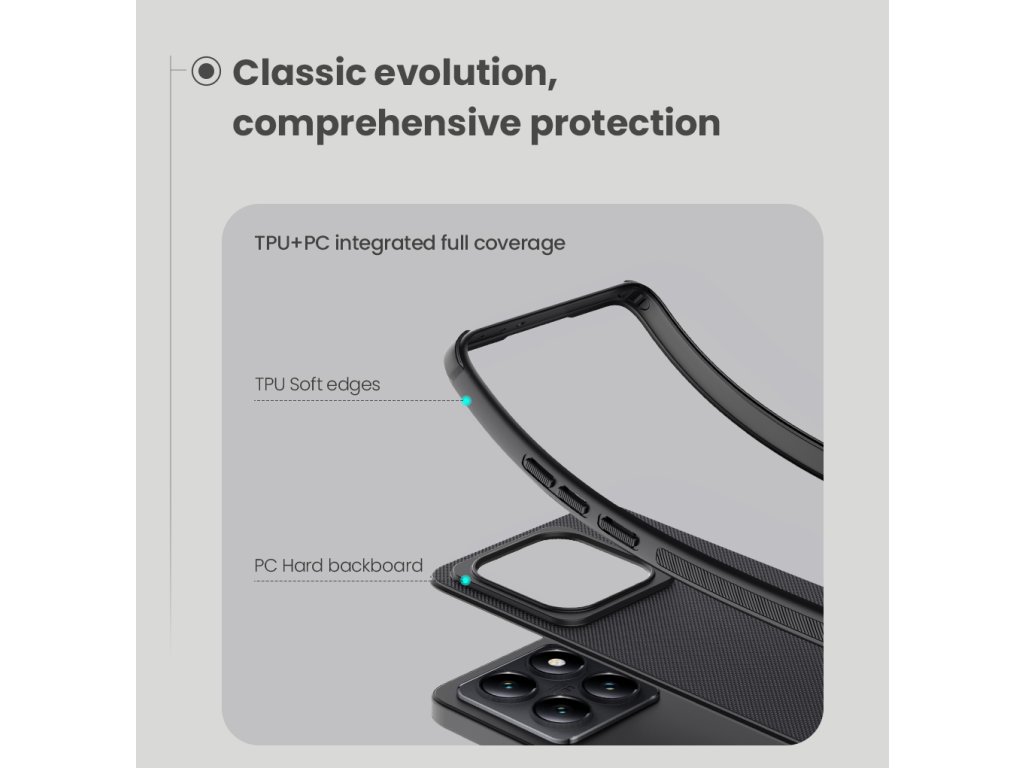 Skládá se z tvrdého a odolného plastu na zadní straně a TPU měkkého plastu na bocích.