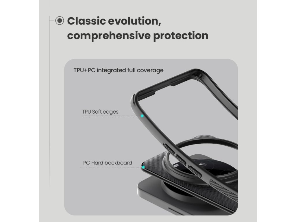 Skládá se z tvrdého a odolného plastu na zadní straně a TPU měkkého plastu na bocích.