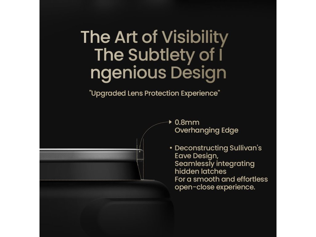 Kreativní design kovového rámu kolem fotoaparátu nejen chrání fotoaparát, ale také slouží jako stojánek.