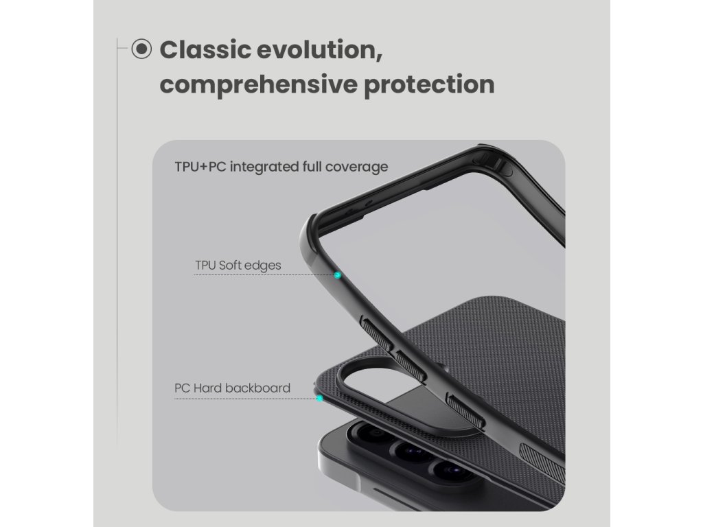 Skládá se z tvrdého a odolného plastu na zadní straně a TPU měkkého plastu na bocích.