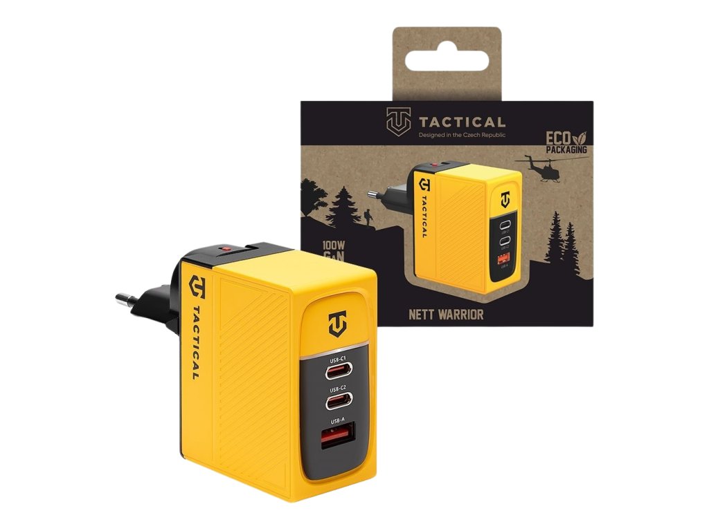 Co je v balení: Nabíječka Tactical Nett Warrior GaN 100W, manuál, Tactical samolepka