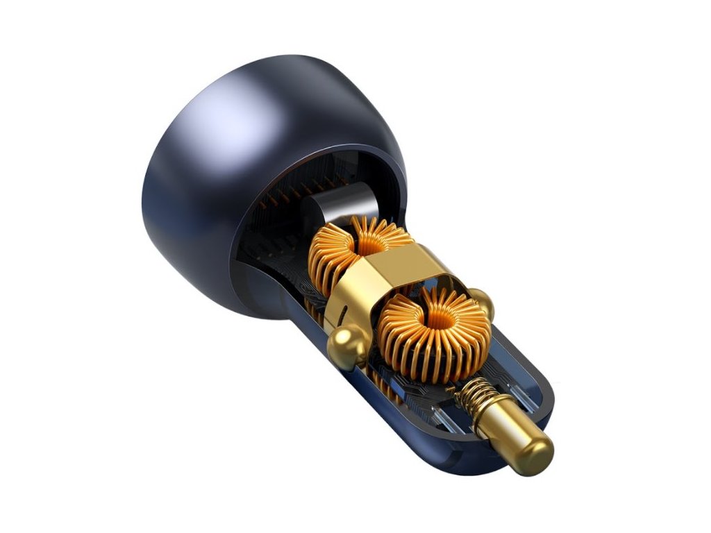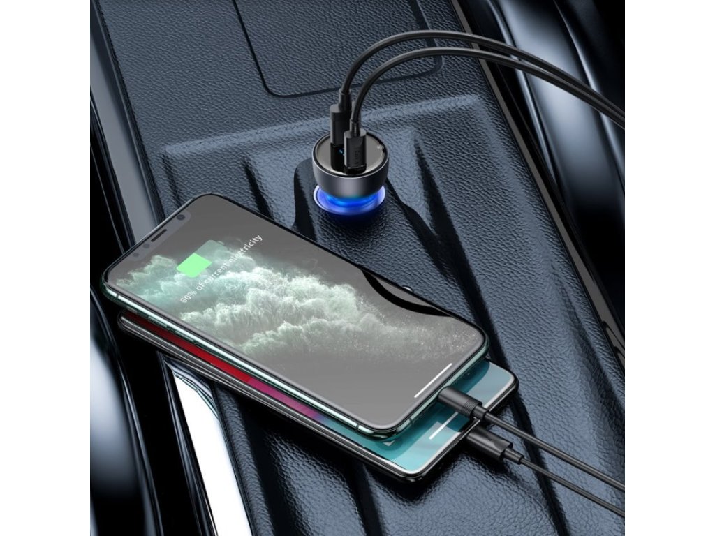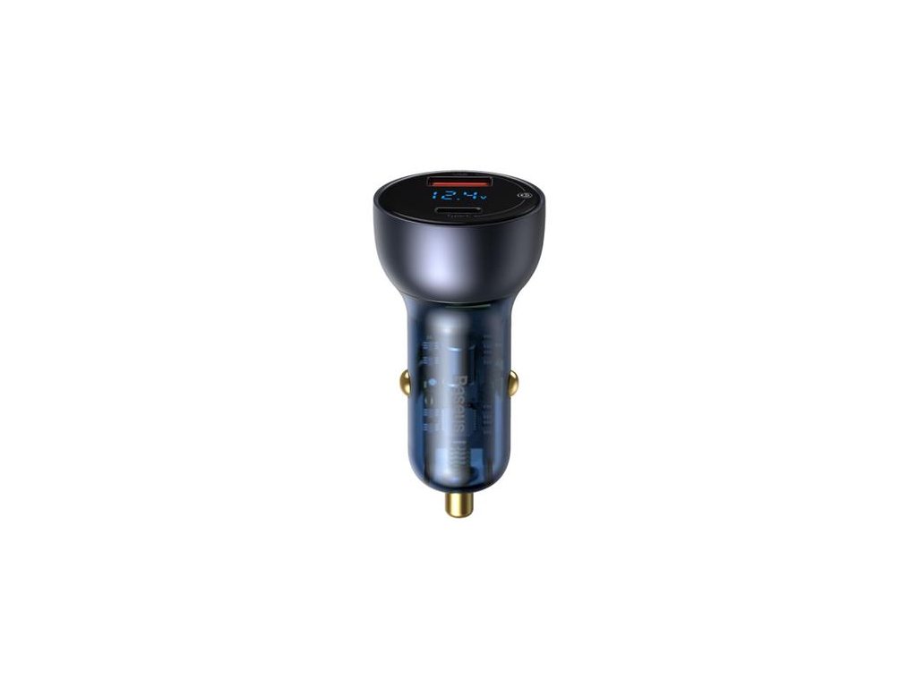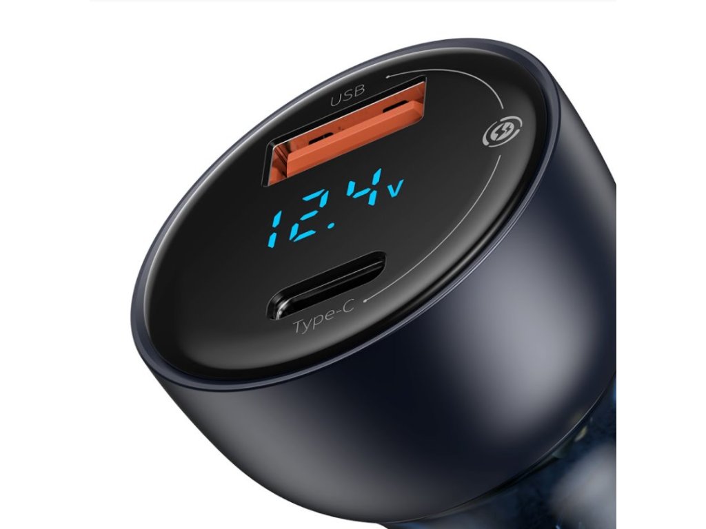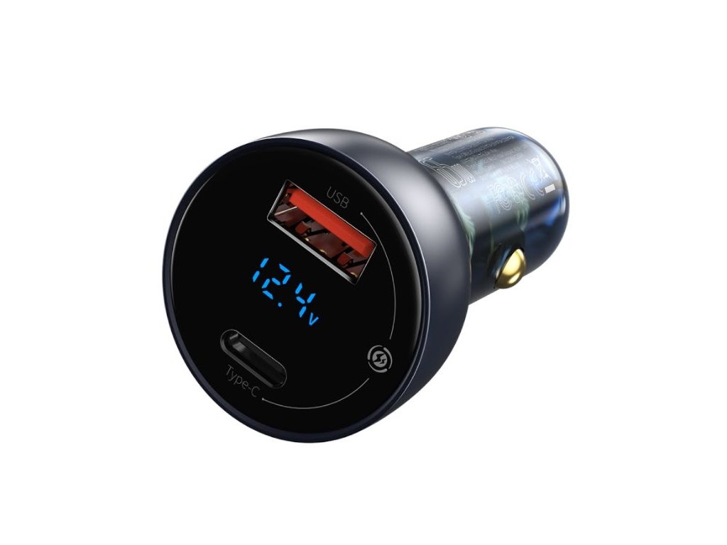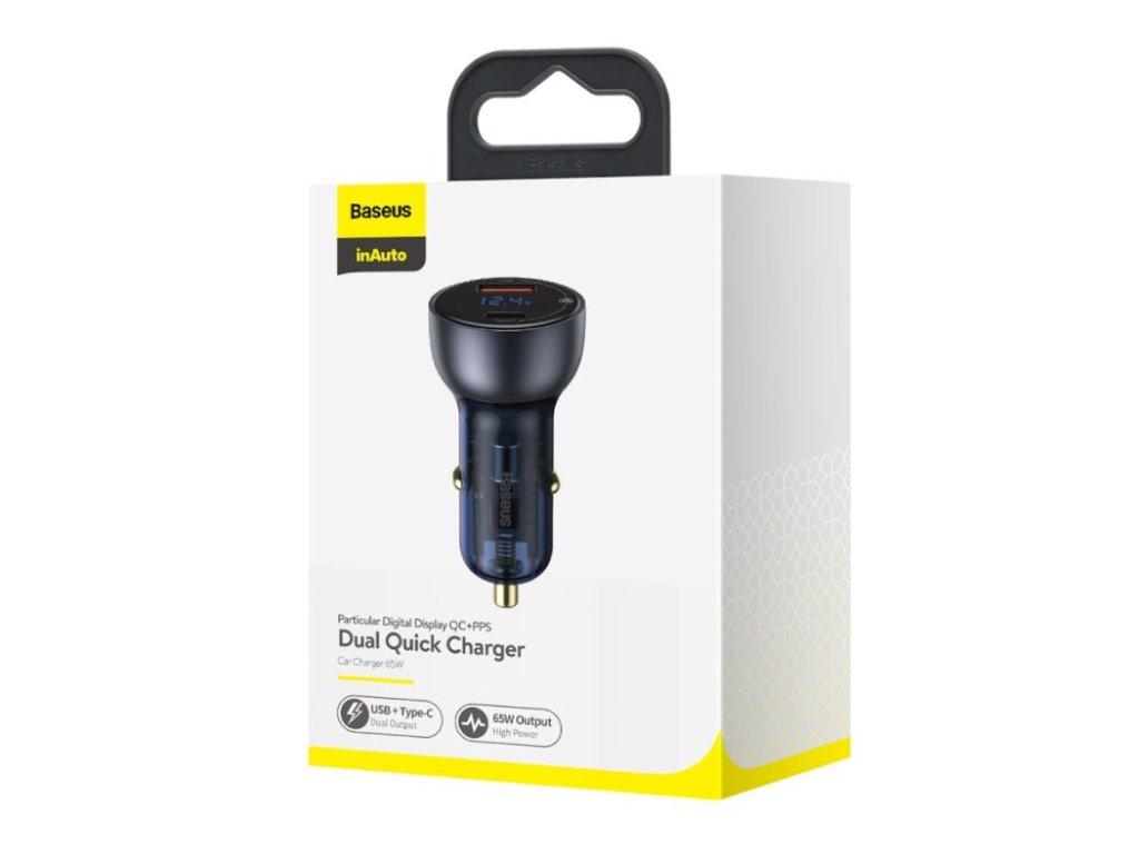 Baseus Particular Digital Display Dual USB nabíječka s výstupem USB a USB-C a LED displejem se stavem nabití akumulátoru ve voze a vysokým výkonem 65W.Nabíječka je vyrobena z atraktivního poloprůhledného ABS plastu.