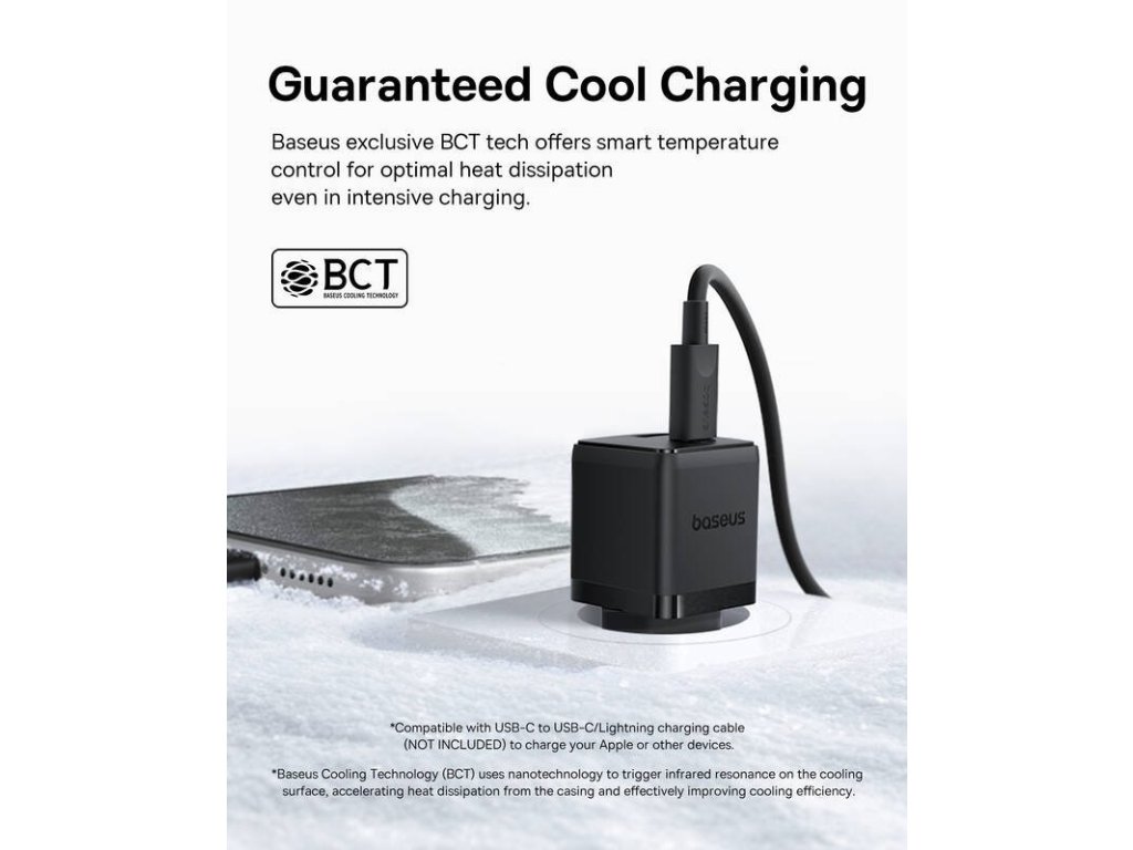 Díky technologii Baseus BCT (Baseus Cooling Technology) automaticky reguluje teplotu pro bezpečné a stabilní nabíjení i při vysokém zatížení.