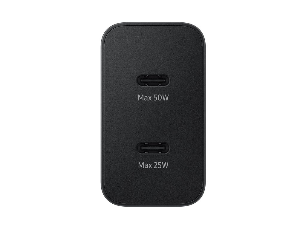 Samsung cestovní nabíječka do sítě s maximálním výkonem 50W, duálním USB-C výstupem a USB-C/USB-C kabelem dlouhým 1,8m.Díky Super Fast Charging 2.0 dokáže rychle dobít vaše zařízení a vy tak nemusíte ztrácet čas.