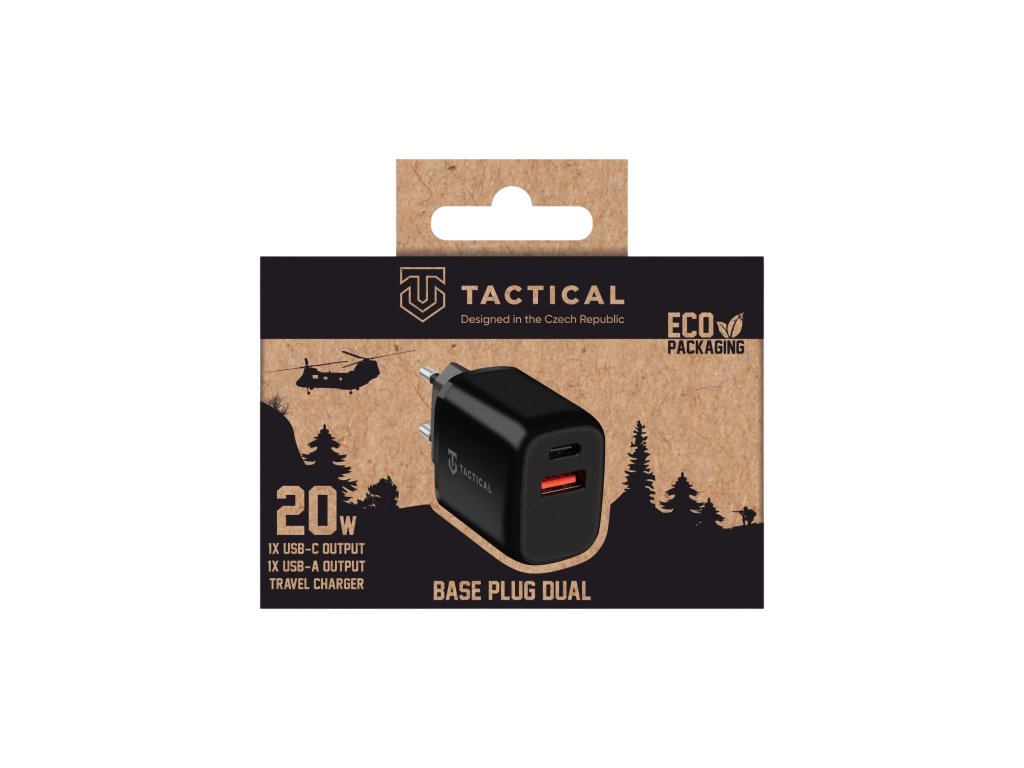 Cestovní nabíječka do sítě Tactical Base Plug Dual s minimalistickým designem, výkonem až 20W a pokročilým systémem PD/QC3.0 pro rychlé a bezpečné dobíjení. Vše produkováno jedním USB-C a jedním, USB-A portem.Rychlá jako střela