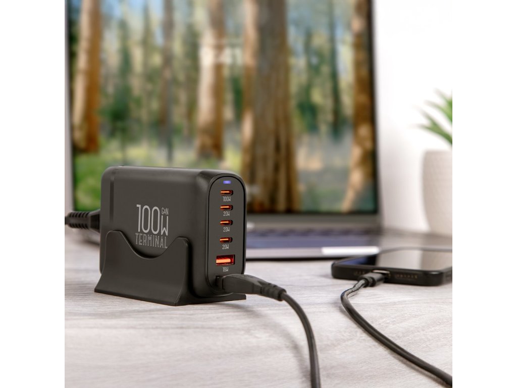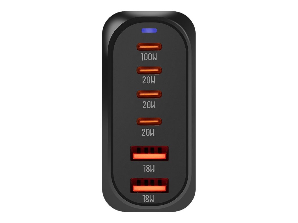 Kombinuje čtyři porty USB-C a dva porty USB-A, čímž umožňuje nabíjet až šest zařízení současně s celkovým výkonem až 100 W.