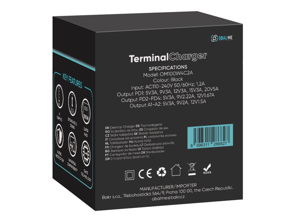 Součástí balení: nabíječka OBAL:ME Terminal, odnímatelný napájecí kabel, stolní podstavec a návod k použití.