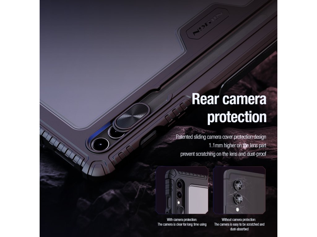 Nillkin Bumper Pro ochranné pouzdro s praktickým flipem, který slouží zároveň jako stojánek je vyrobeno z vybraného materiálu TPU a PC.Čočka fotoaparátu je chráněna posuvným krytem