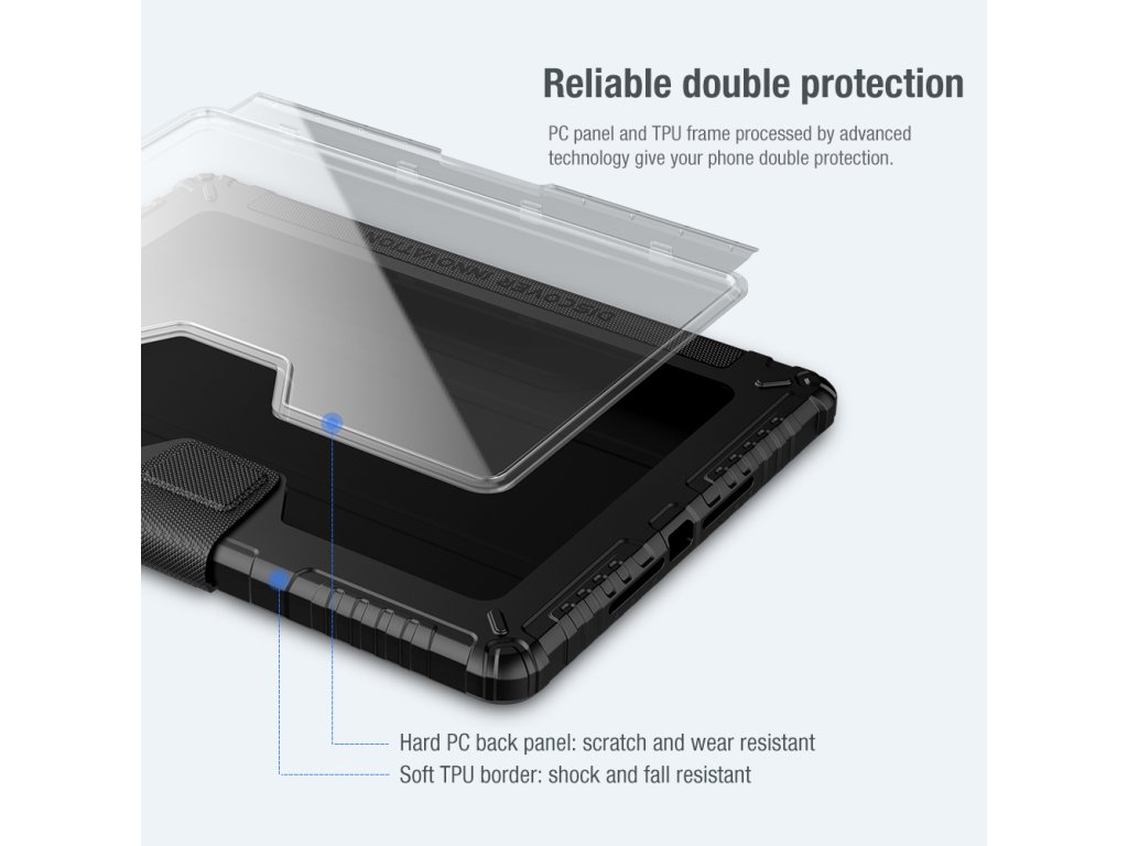 Nillkin Bumper Pro ochranné pouzdro s praktickým flipem, který slouží zároveň jako stojánek je vyrobeno z vybraného materiálu TPU a PC.Čočka fotoaparátu je chráněna posuvným krytem