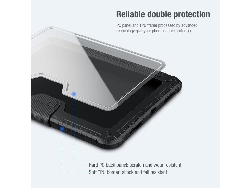Nillkin Bumper Pro ochranné pouzdro s praktickým flipem, který slouží zároveň jako stojánek je vyrobeno z vybraného materiálu TPU a PC.Čočka fotoaparátu je chráněna posuvným krytem