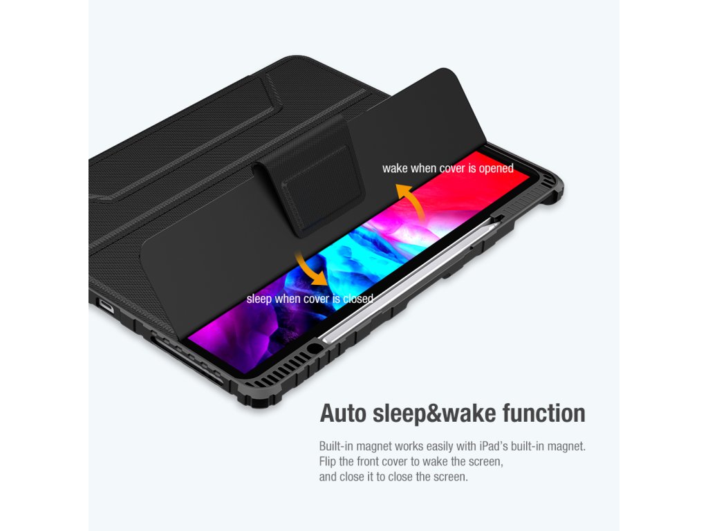 Vestavěná sestava magnetů podporuje funkce iPad pro automatické probuzení / spánek. V pouzdře najdete prostor pro vaši Apple tužku.