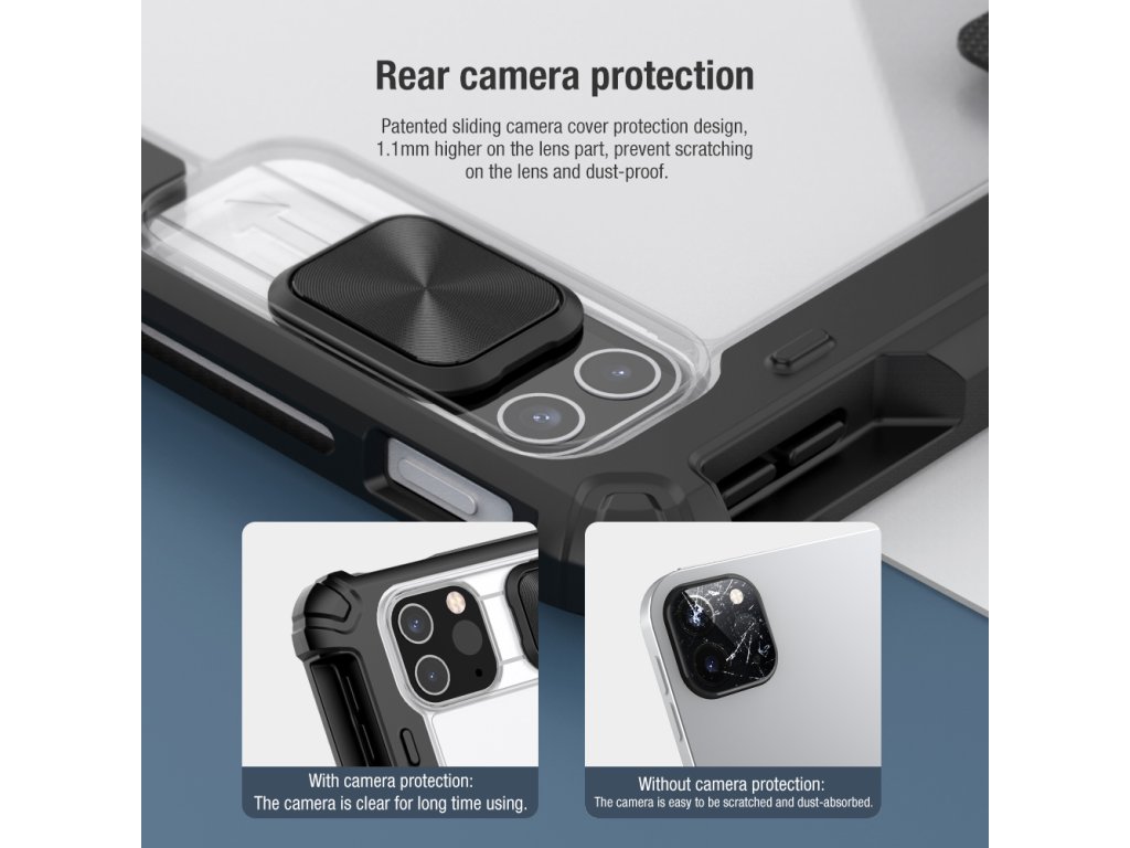 Nillkin Bumper Pro ochranné pouzdro s praktickým flipem, který slouží zároveň jako stojánek je vyrobeno z vybraného materiálu TPU a PC.Čočka fotoaparátu je chráněna posuvným krytem