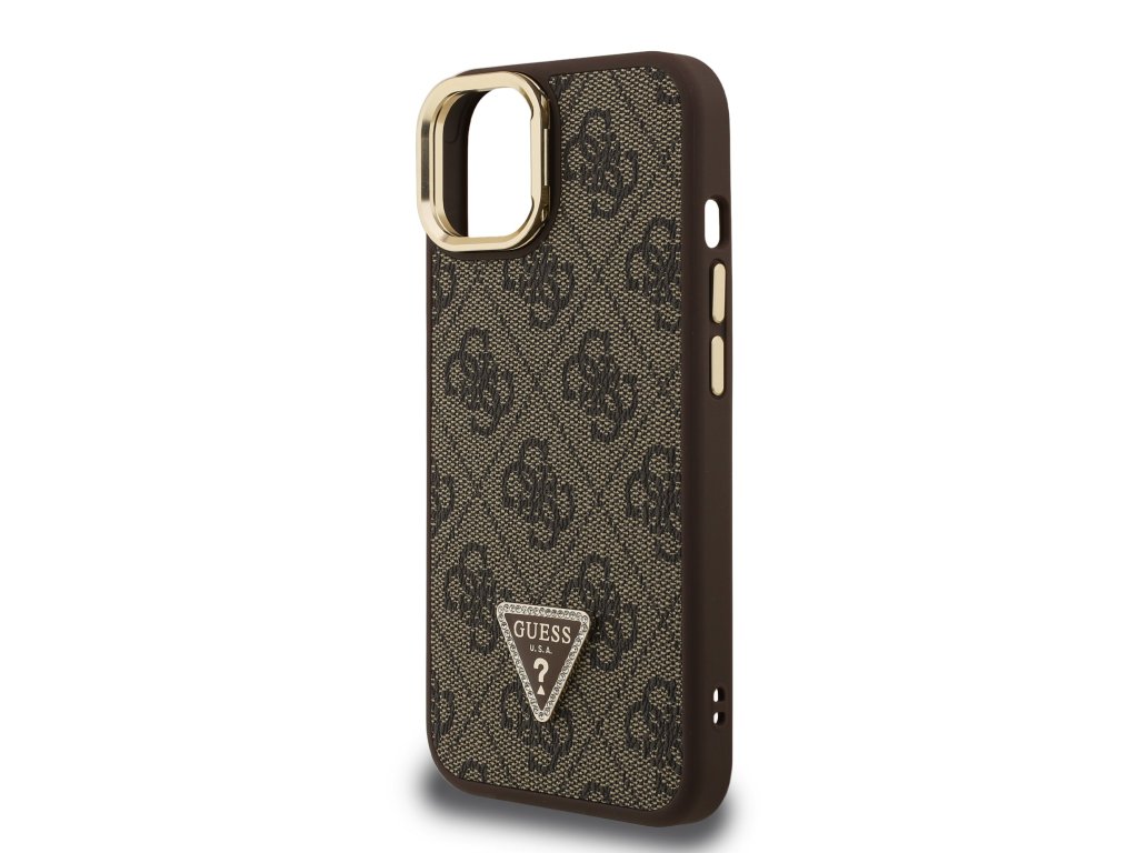 Guess PU 4G Strass Triangle Logo Stand Camera Frame MagSafe Zadní Kryt pro iPhone 14 Brown