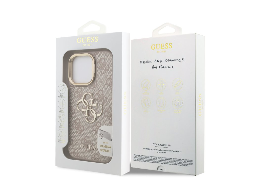 Prémiový zadní kryt Guess PU 4G Metal Logo Stand Camera Frame se vyznačuje elegantním, charakteristickým 4G vzorem, doplněným o logo GUESS.Kryt je vyrobený z lehkého a odolného polyuretanu (PU) s povrchovou úpravou z PU kůže a nabízí tak nejen skvělou ochranu telefonu, ale také pohodlí při používání.