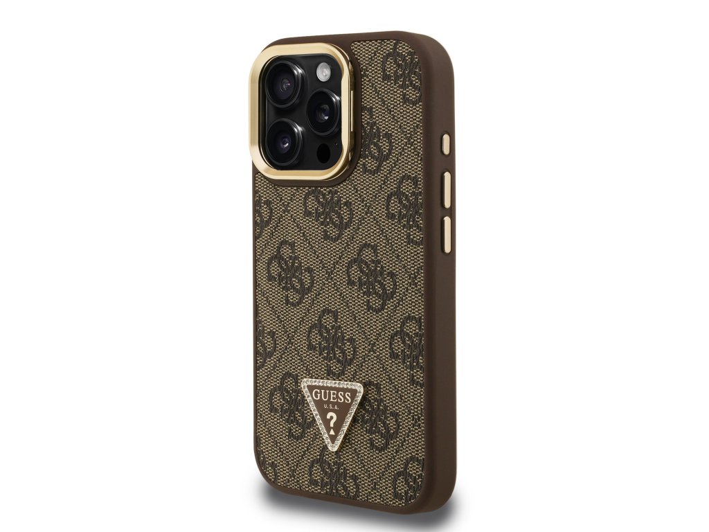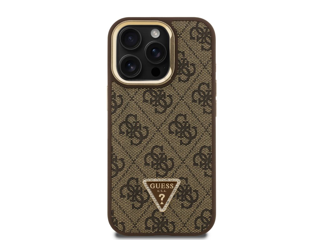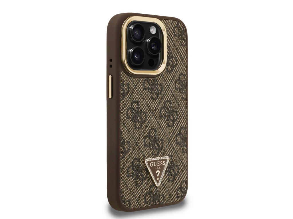 Guess PU 4G Strass Triangle Logo Stand Camera Frame MagSafe Zadní Kryt pro iPhone 15 Pro Brown