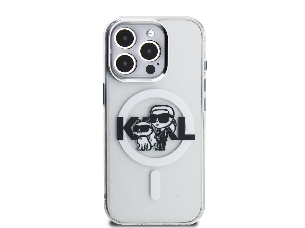 Karl Lagerfeld IML Glitter Karl and Choupette Sketch MagSafe Zadní Kryt pro iPhone 15 Pro Transparent
