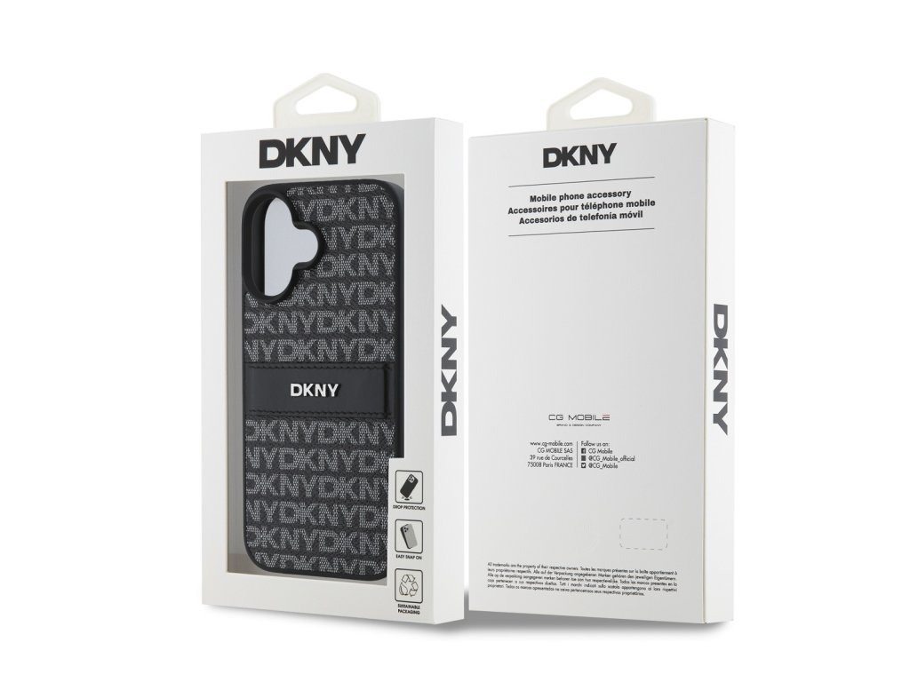 Design krytu telefonu má elegantní, moderní estetiku s opakujícím se vzorem loga "DKNY" po celé zadní straně a výrazným pruhem s nepřehlédnutelným ikonickým logem.