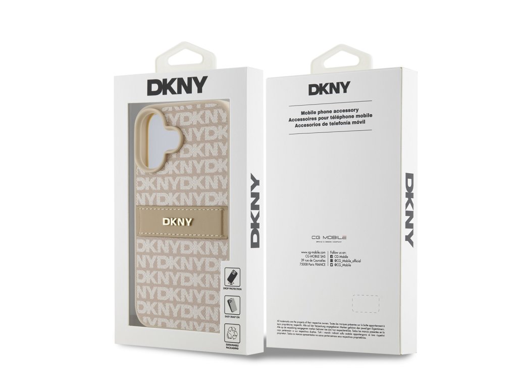 Design krytu telefonu má elegantní, moderní estetiku s opakujícím se vzorem loga "DKNY" po celé zadní straně a výrazným pruhem s nepřehlédnutelným ikonickým logem.