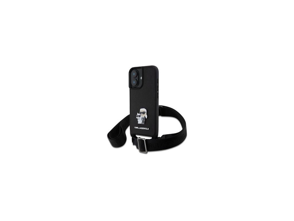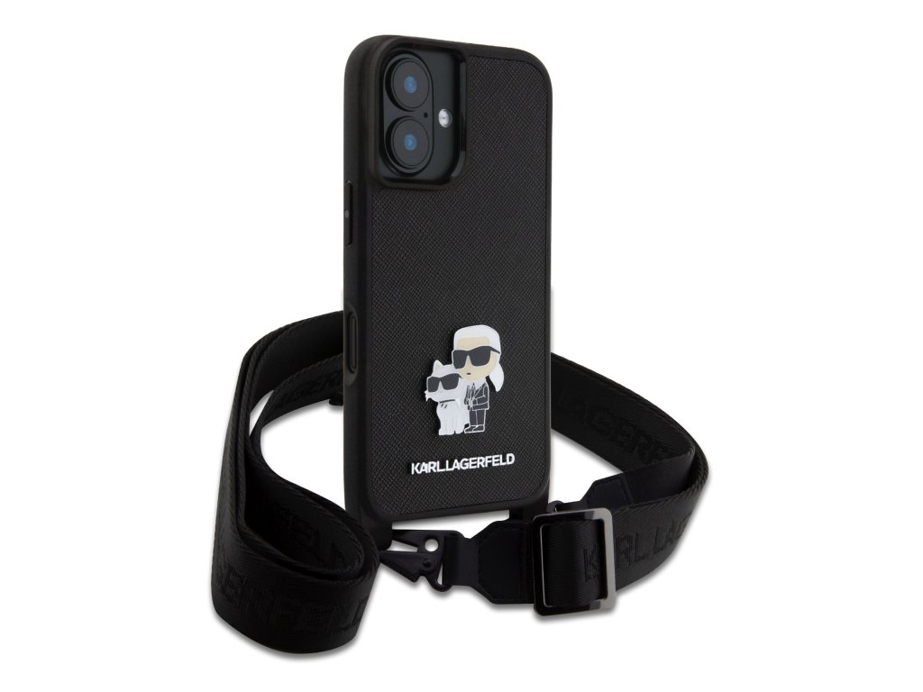 Karl Lagerfeld Saffiano Crossbody Popruh Metal Karl and Choupette Zadní Kryt pro iPhone 16 Plus Black