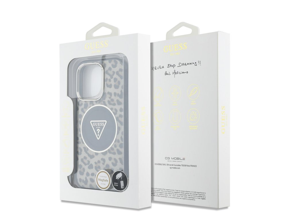 Guess IML Leopard Triangle Logo Strap MagSafe zadní kryt na telefon je skvělým doplňkem pro všechny milovníky stylu a praktičnosti.Tento kryt je vyroben z kombinace pevného PC plastu na zadní straně a TPU měkkého plastu na bocích, což vytváří dokonalou symbiózu odolnosti a pohodlí.