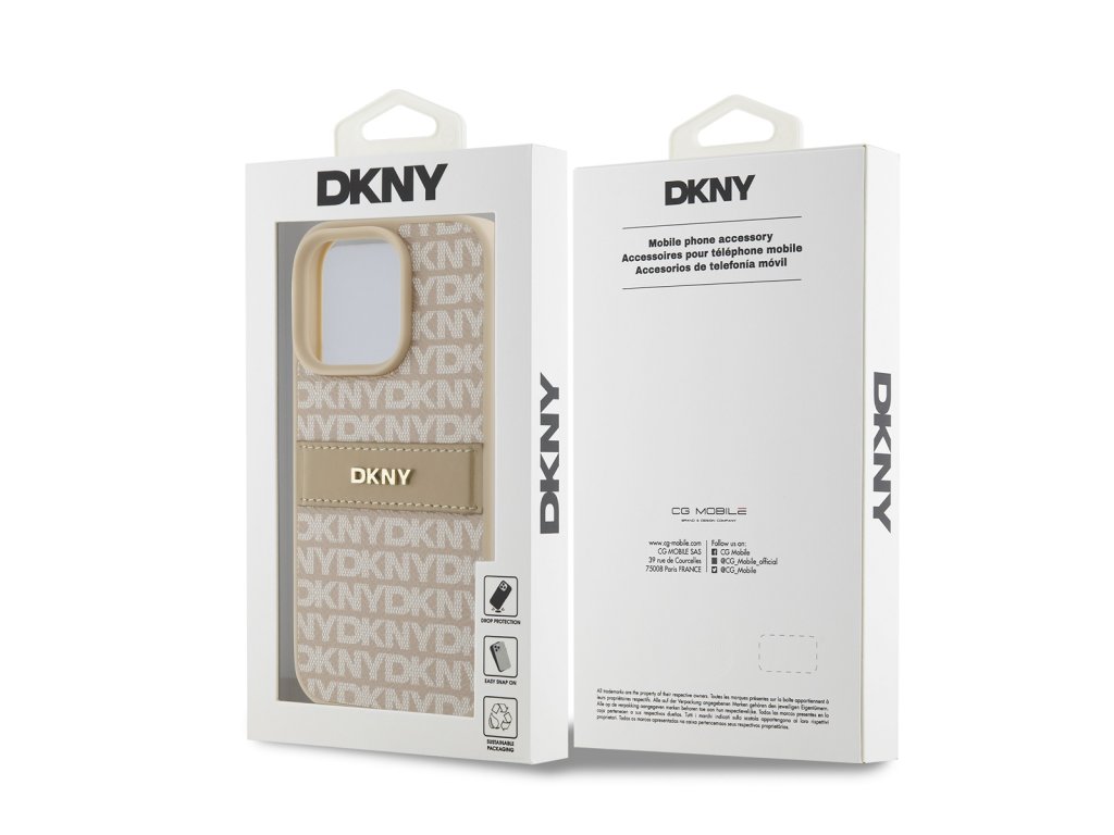 Design krytu telefonu má elegantní, moderní estetiku s opakujícím se vzorem loga "DKNY" po celé zadní straně a výrazným pruhem s nepřehlédnutelným ikonickým logem.