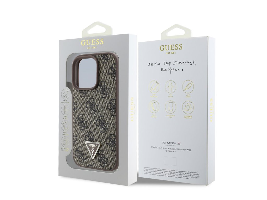 Prémiový zadní kryt Guess PU 4G Strass Triangle Metal Logo se vyznačuje elegantním, charakteristickým 4G vzorem, doplněným o zlaté triangle logo GUESS.Kryt je vyrobený z pružného a pevného PU materiálu s povrchovou úpravou z PU kůže a nabízí tak nejen skvělou ochranu telefonu, ale také pohodlí při používání.