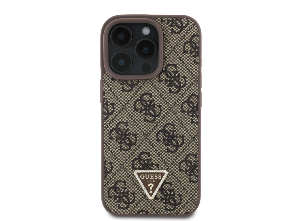 Guess PU 4G Strass Triangle Metal Logo Zadní Kryt pro iPhone 16 Pro Brown