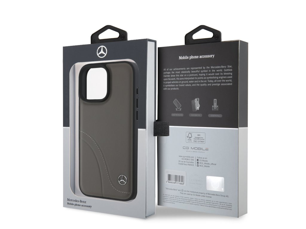 Mercedes Curved Stitches Leather prémiový kryt vyrobený z kombinace odolného a pružného PU na zadní straně potaženého pravou kůží.Boky krytu jsou z pružného PU materiálu v černé barvě. Usnadňují instalaci krytu a spolehlivě chrání telefon před otřesy a poškozením.