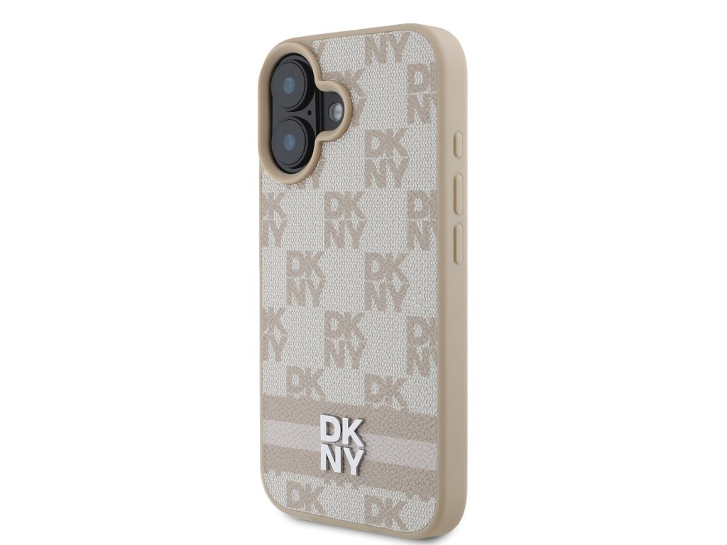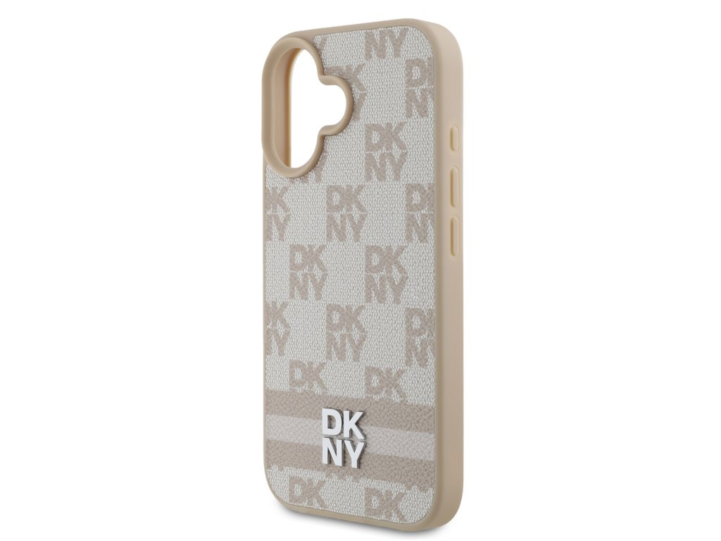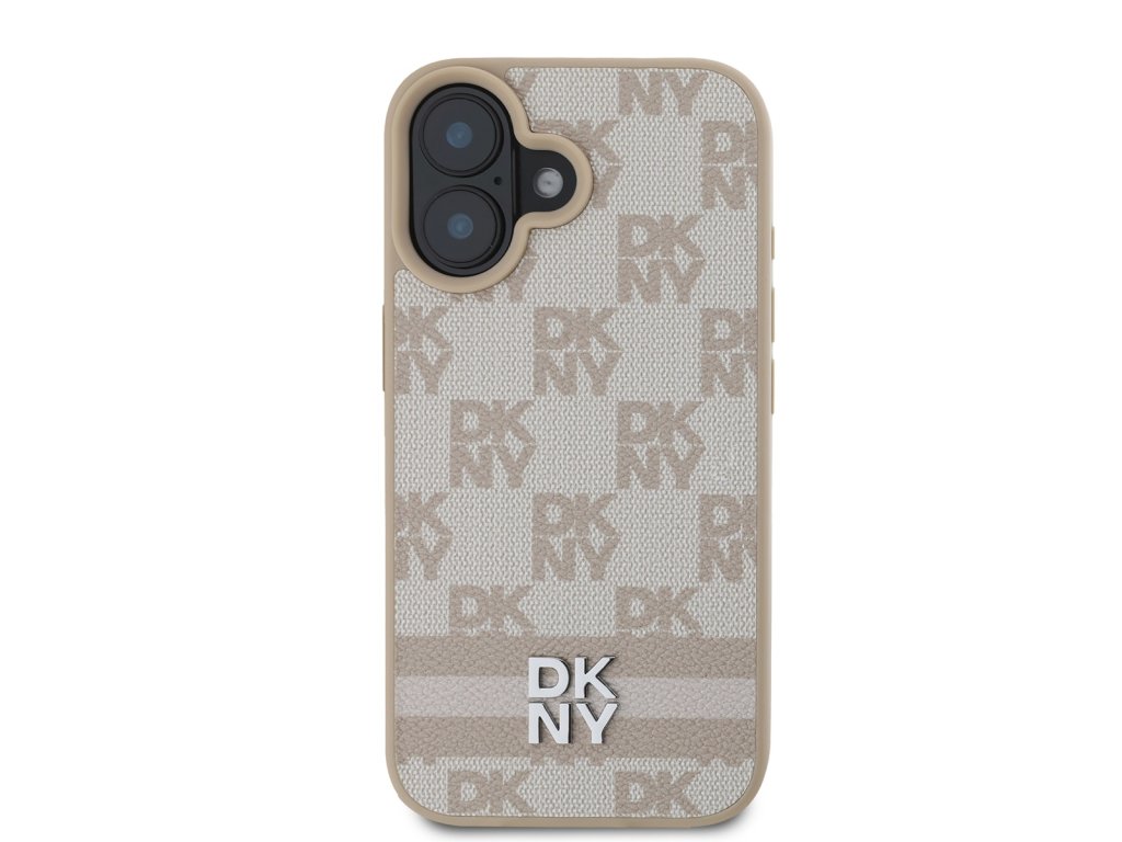 DKNY PU Leather Checkered Pattern and Stripe Zadní Kryt pro iPhone 16 Pink