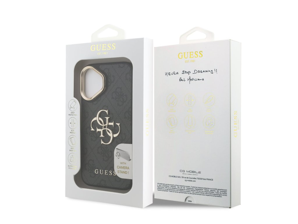 Prémiový zadní kryt Guess PU 4G Metal Logo Stand Camera Frame se vyznačuje elegantním, charakteristickým 4G vzorem, doplněným o logo GUESS.Kryt je vyrobený z lehkého a odolného polyuretanu (PU) s povrchovou úpravou z PU kůže a nabízí tak nejen skvělou ochranu telefonu, ale také pohodlí při používání.
