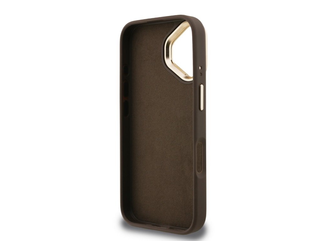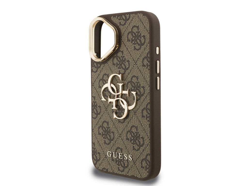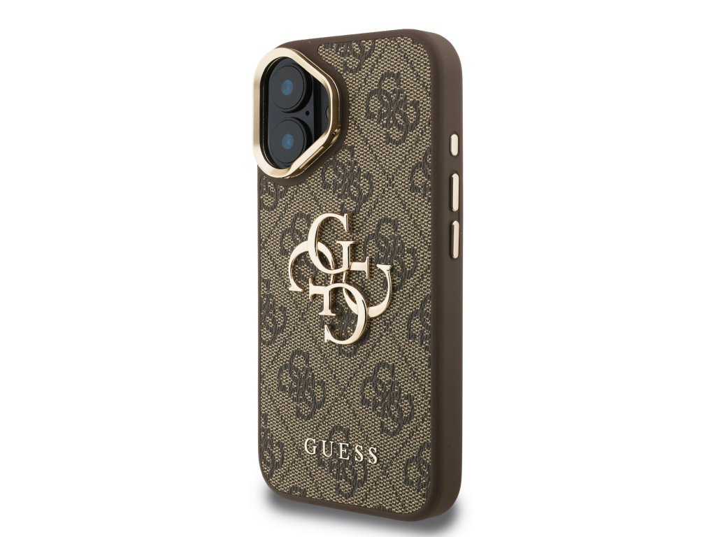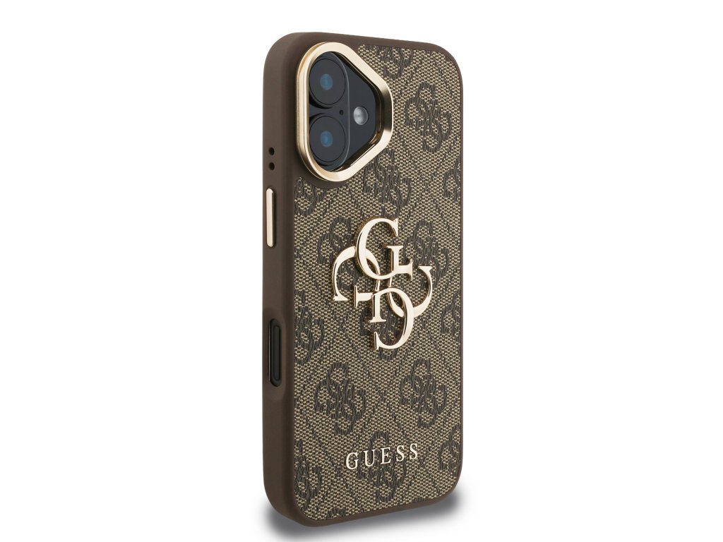 Guess PU 4G Metal Logo Stand Camera Frame Zadní Kryt pro iPhone 16 Brown
