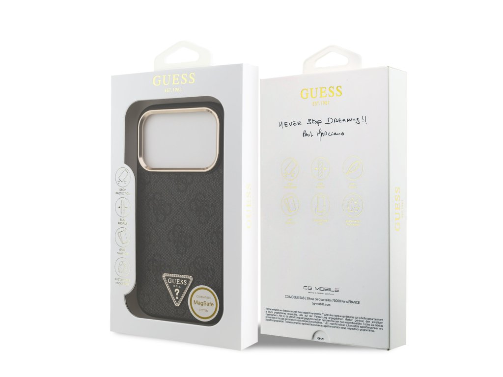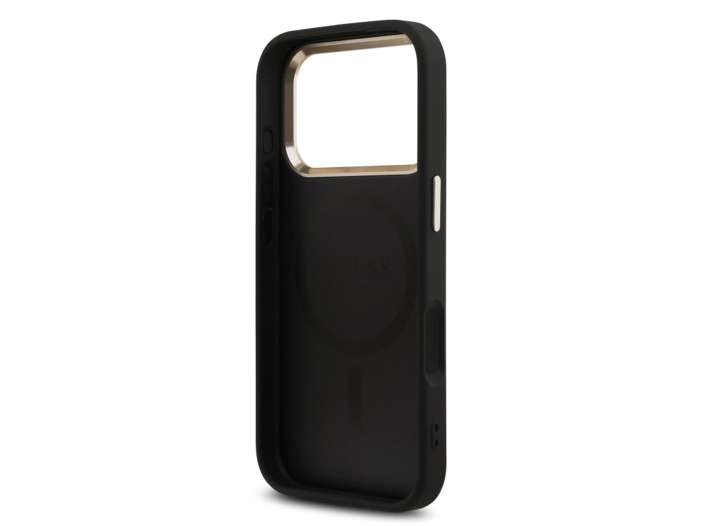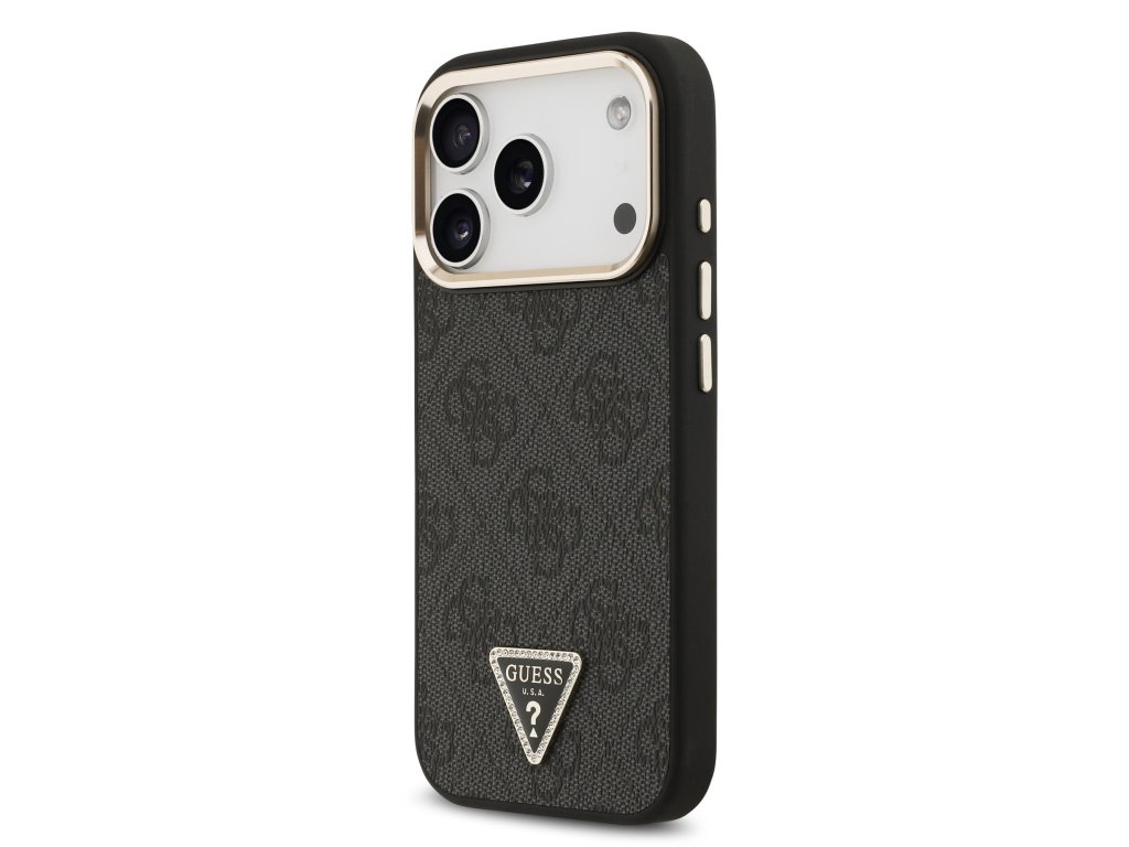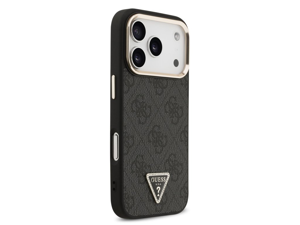Guess PU Leather 4G Strass Triangle Logo Gold Frame MagSafe Zadní Kryt pro iPhone 17 Pro Black