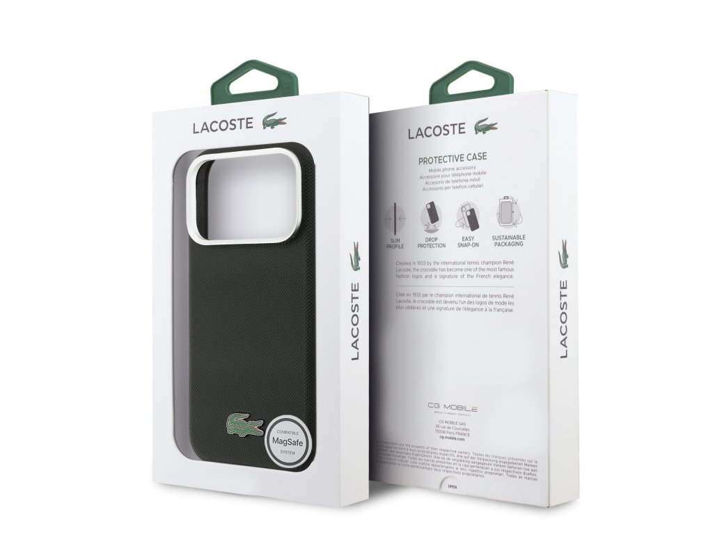 Lacoste Iconic Petit Pique Metal Logo MagSafe zadní kryt je dokonalý doplněk pro váš telefon i váš outfit, který kombinuje funkčnost a styl v jednom.Je vyrobený z lehké a odolného PU materiáliu a nabízí skvělou ochranu a pohodlí při používání. Vnitřní výstelka z jemného mikrovlákna zajišťuje, že váš telefon bude chráněn před poškrábáním a drobnými poškozeními.