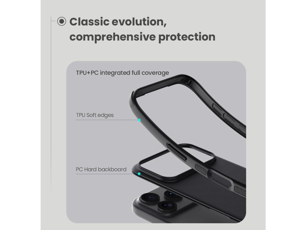 Skládá se z tvrdého a odolného plastu na zadní straně a TPU měkkého plastu na bocích.