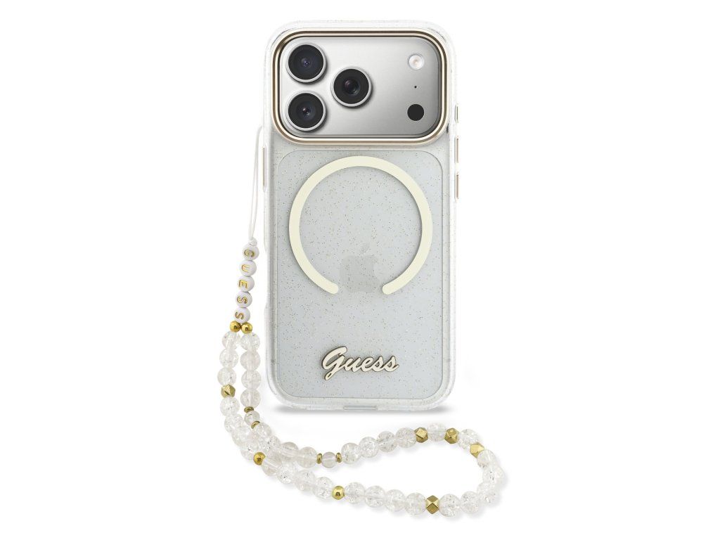 Guess IML Glitter Script Strap MagSafe Zadní Kryt pro iPhone 17 Pro Max Transparent
