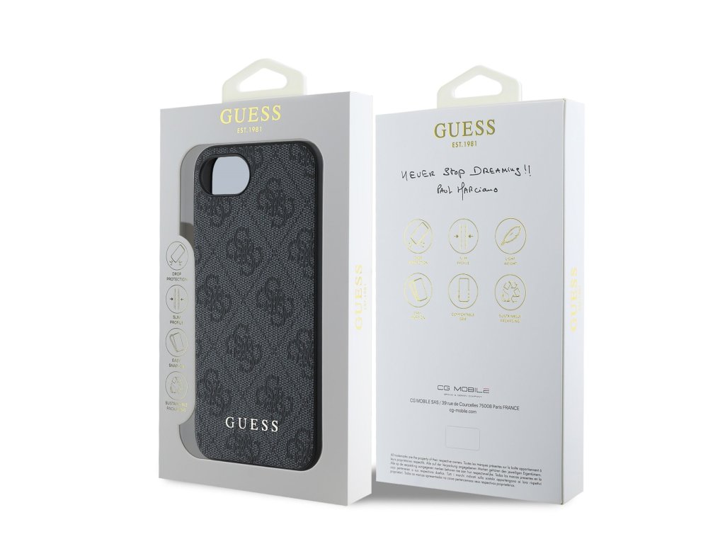 Prémiový zadní kryt Guess 4G Charm se vyznačuje elegantním, charakteristickým 4G vzorem, doplněným o zlaté logo GUESS.Kryt je vyrobený z lehkého a odolného polykarbonátu (PC) s povrchovou úpravou z PU kůže a nabízí tak nejen skvělou ochranu telefonu, ale také pohodlí při používání.