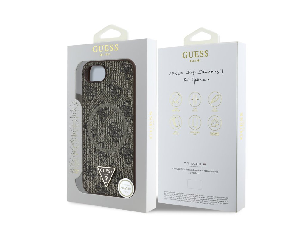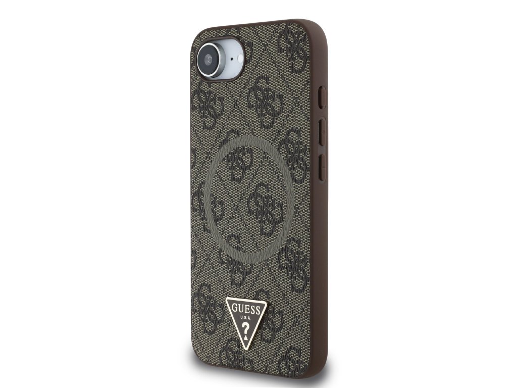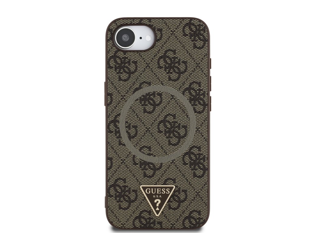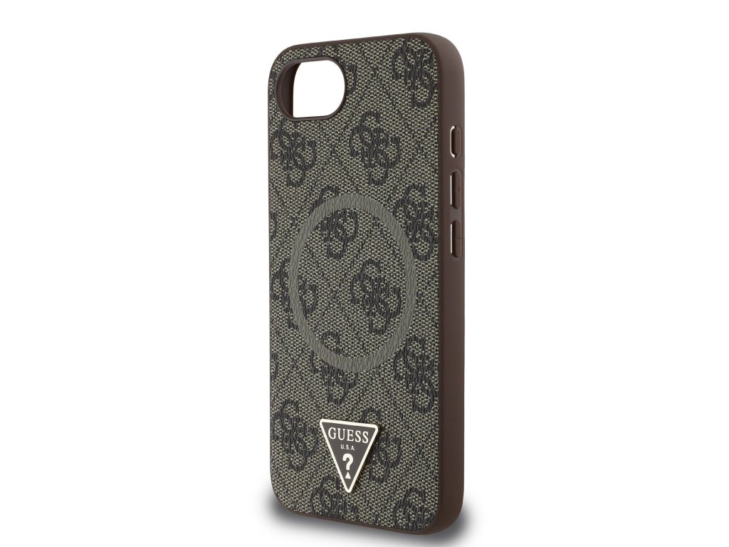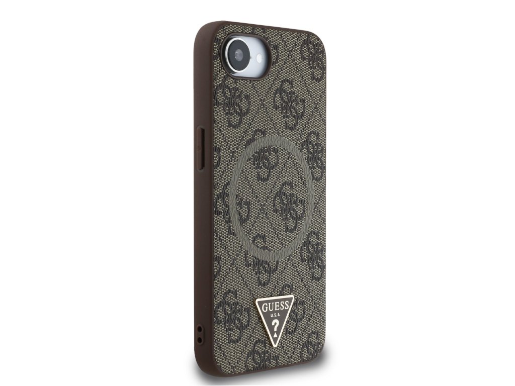 Guess PU 4G Strass Triangle Metal Logo MagSafe Zadní Kryt pro iPhone 16e Brown