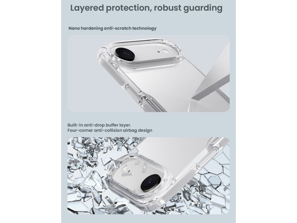 Odolný a pevný polykarbonát (PC) na zadní straně, který je odolný proti poškrábání a TPU pružný materiál na bocích.