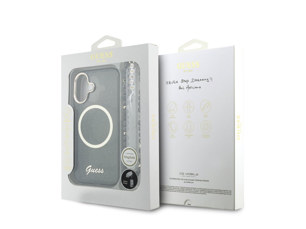 Guess IML Glitter Script Strap MagSafe zadní kryt na telefon je skvělým doplňkem pro všechny milovníky stylu a praktičnosti.Tento kryt je vyroben z kombinace pevného PC plastu na zadní straně a TPU měkkého plastu na bocích, což vytváří dokonalou symbiózu odolnosti a pohodlí.