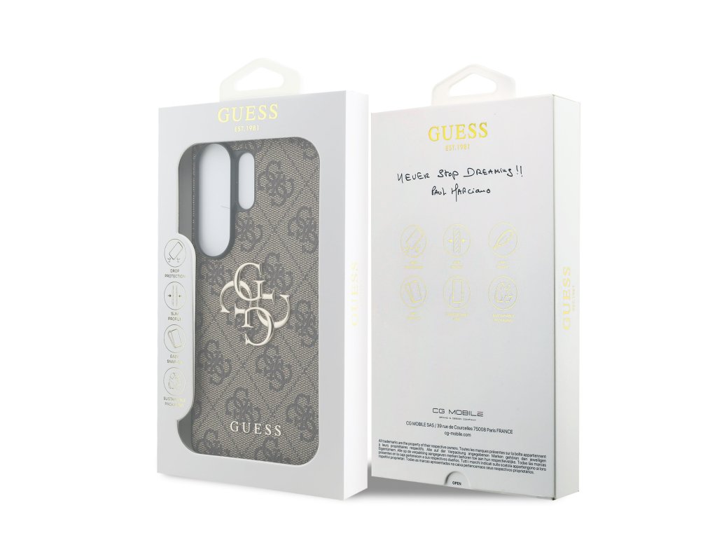 Prémiový zadní kryt Guess PU 4G Metal Logo se vyznačuje elegantním, charakteristickým 4G vzorem, doplněným o logo GUESS.Kryt je vyrobený z lehkého a odolného polyuretanu (PU) s povrchovou úpravou z PU kůže a nabízí tak nejen skvělou ochranu telefonu, ale také pohodlí při používání.
