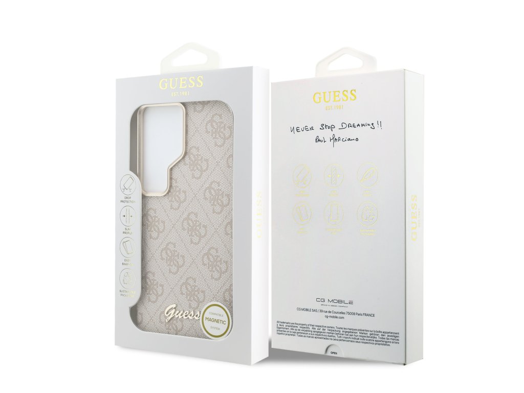 Prémiový zadní kryt Guess 4G se vyznačuje elegantním, charakteristickým 4G vzorem, doplněným o zlaté logo GUESS.Kryt je vyrobený z lehkého a odolného polykarbonátu (PC) s povrchovou úpravou z PU kůže a nabízí tak nejen skvělou ochranu telefonu, ale také pohodlí při používání.