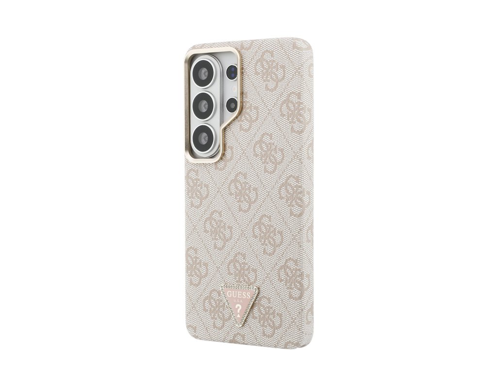 Guess PU Leather 4G Strass Triangle Logo Gold Frame zadní kryt je dokonalý doplněk pro váš telefon i váš outfit, který kombinuje funkčnost a styl v jednom.Je vyrobený z lehké a odolné PU umělé kůže a nabízí skvělou ochranu a pohodlí při používání.