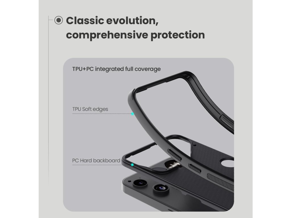 Skládá se z tvrdého a odolného plastu na zadní straně a TPU měkkého plastu na bocích.