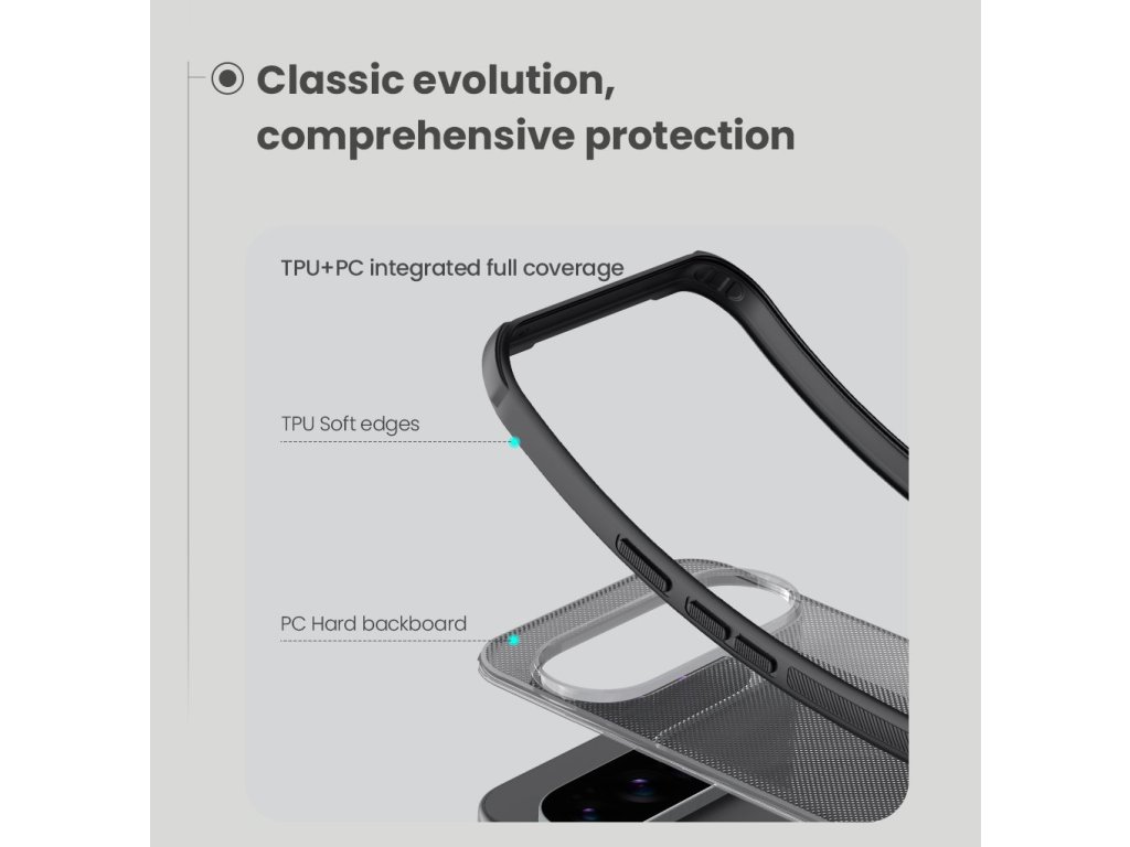 Skládá se z tvrdého a odolného plastu na zadní straně a TPU měkkého plastu na bocích.