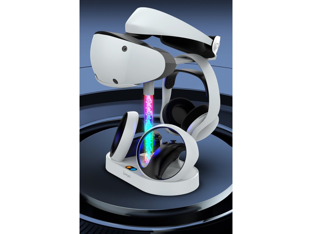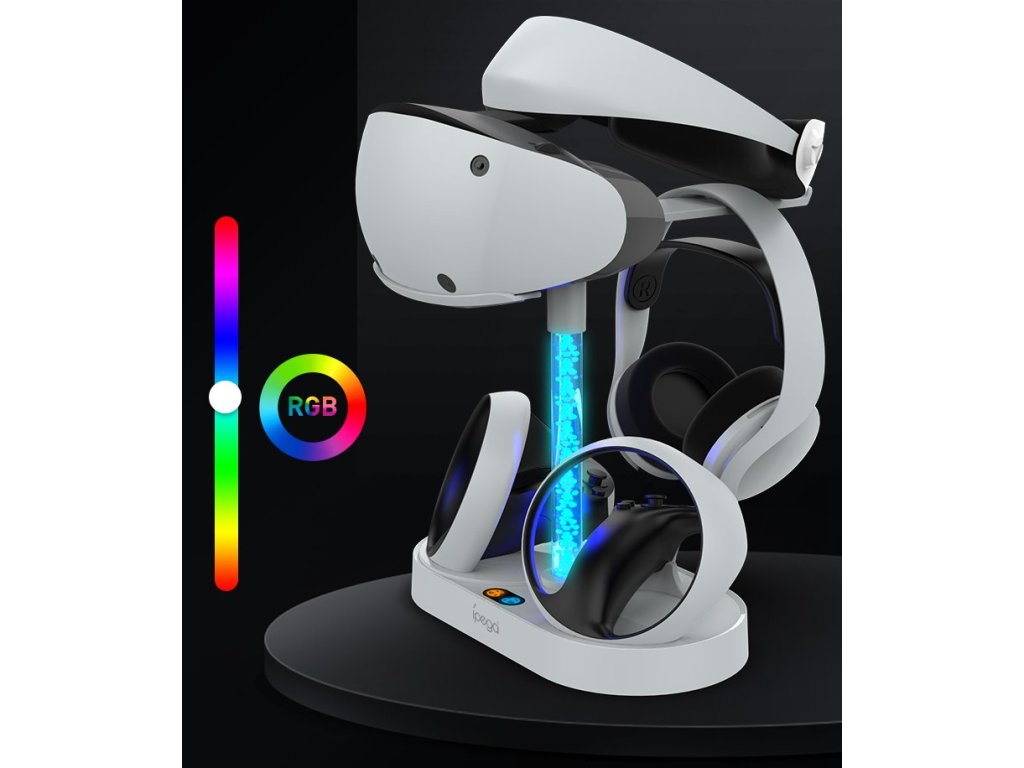 iPega Multifunkční nabíjecí stojan pro PlayStation VR2 ovladače a odkládací místo pro VR2 Brýle a Vaše sluchátka.Připravte se na nový herní zážitek s VR2 brýlemi a ovladači.