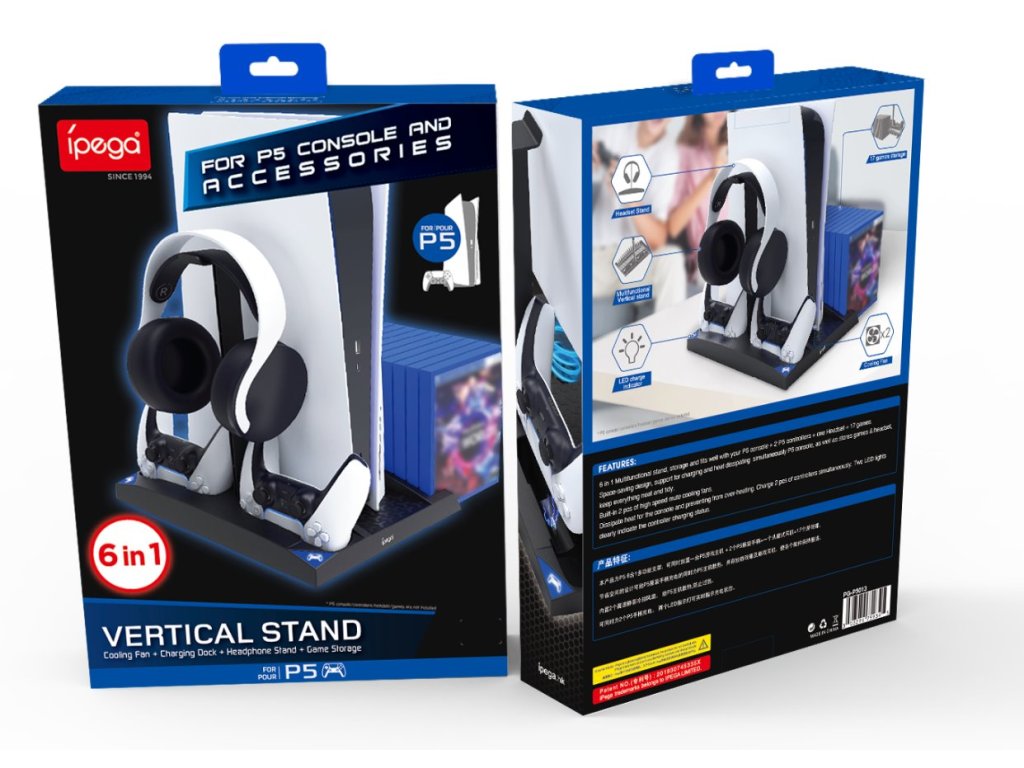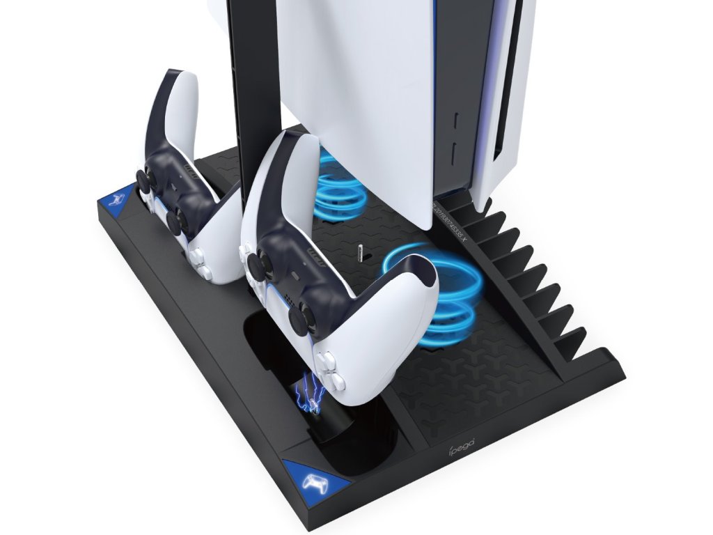 iPega P5013 dobíjecí stanice a stojan s chlazením pro Playstation 5. Praktický stojan pro váš PS5 s integrovanými ventilátory pro to nejlepší chlazení během dlouhých hodin hraní. Stojan je dále vybaven nabíječkou pro dva ovladače, praktickým stojanem na sluchátka a pořadačem na oblíbené hry. Instalace nezabere prakticky téměř žádný čas. Stačí konzoli do stojanu postavit a zespodu ji zafixovat pomocí přiloženého kolíku. Propojení stanice s PS5 je pomocí jednoho USB kabelu. Indikace stavu nabití pro ovladače je samozřejmostí. Parametry - praktický stojan pro PS5 a příslušenství - ventilátory pro chlazená herní konzole - dobíjecí stanice pro dva PS5 ovladače - praktický stojan na sluchátka - pořadač na oblíbené hry - propojení pomocí USB kabelu - snadná instalace - materiál plastDoplňkové parametry