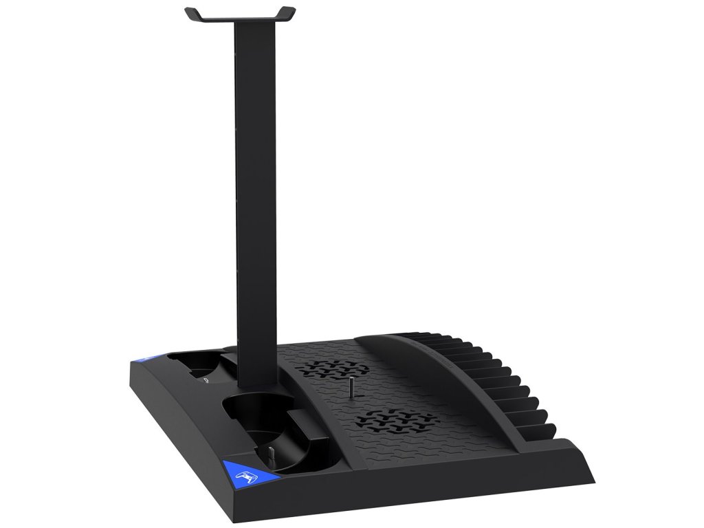 Stojan je dále vybaven nabíječkou pro dva ovladače, praktickým stojanem na sluchátka a pořadačem na oblíbené hry.
