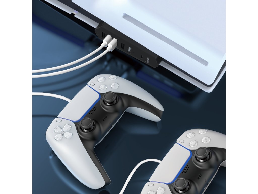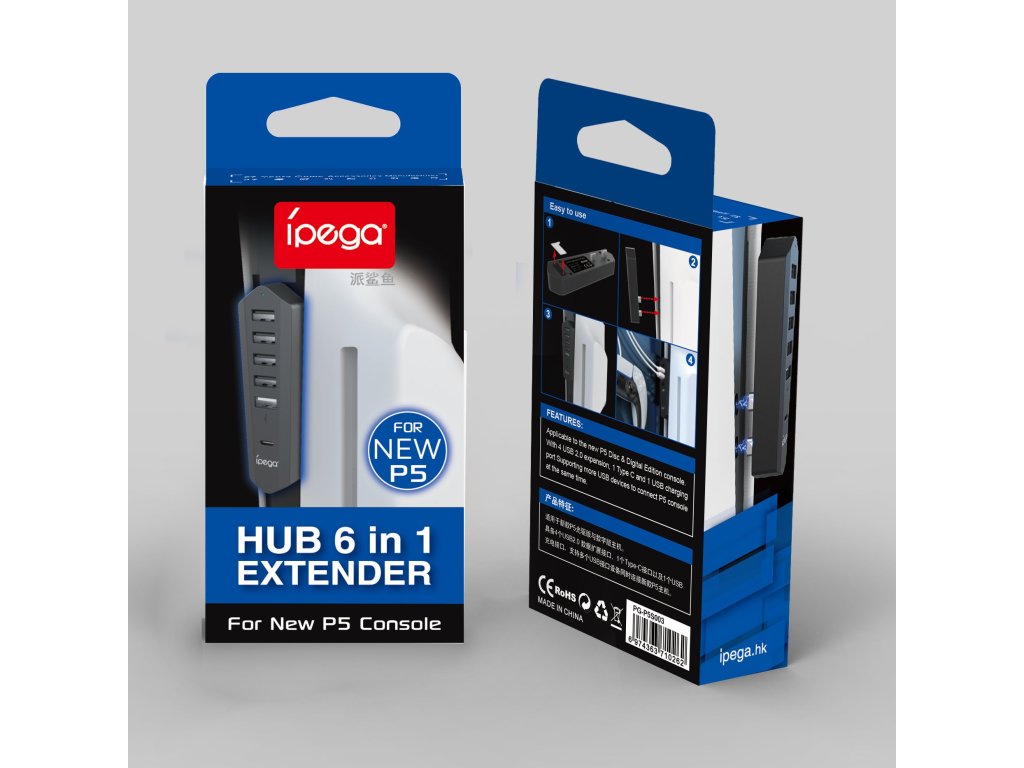 iPega P5S003 rozšiřující HUB určený pro Playstation 5 Slim s jedním USB-C a pěti USB-A výstupy.Když potřebujete připojit nabíječku pro ovladač, myš nebo klávesnici a porty na čelní straně už vám nestačí, tak tento USB HUB je ideálním řešením,