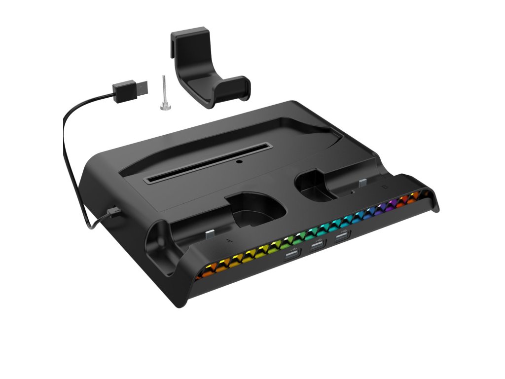 Stojan dále je vybaven nabíječkou pro dva ovladače, praktickým stojanem na sluchátka, třemi USB porty a RGB podsvícením.