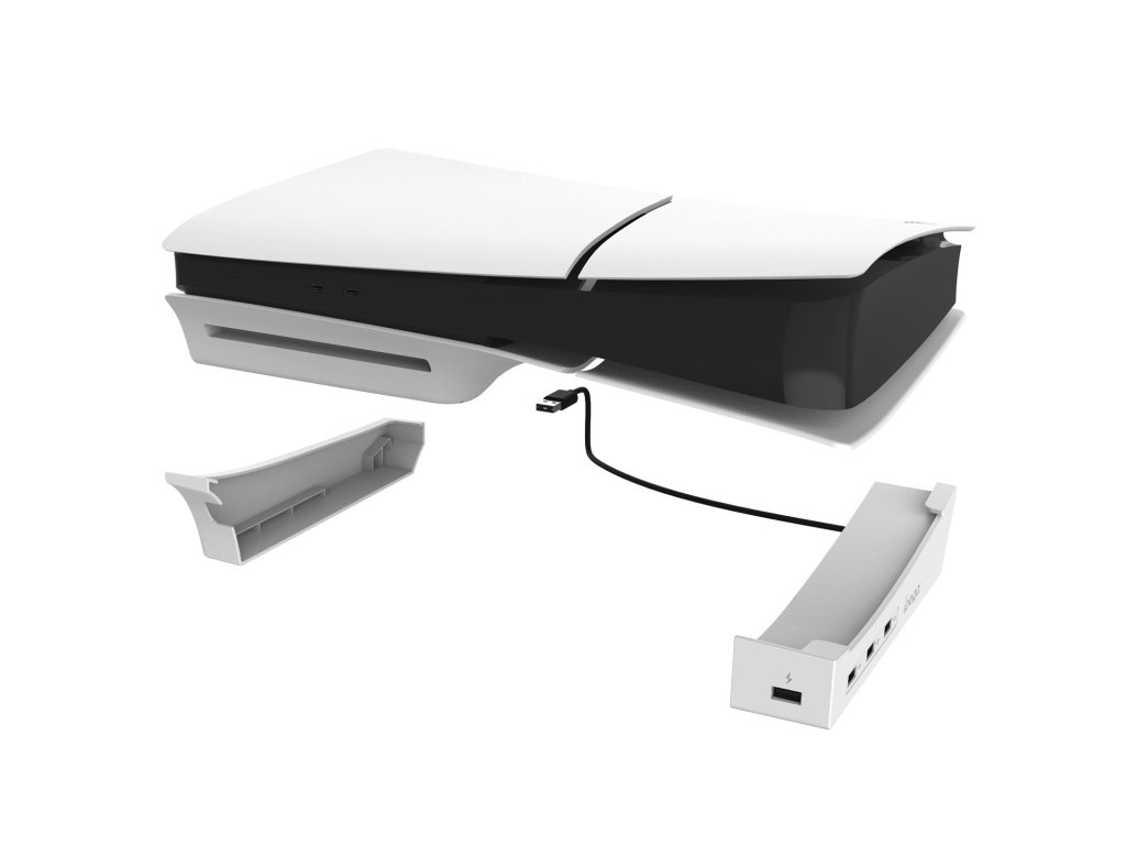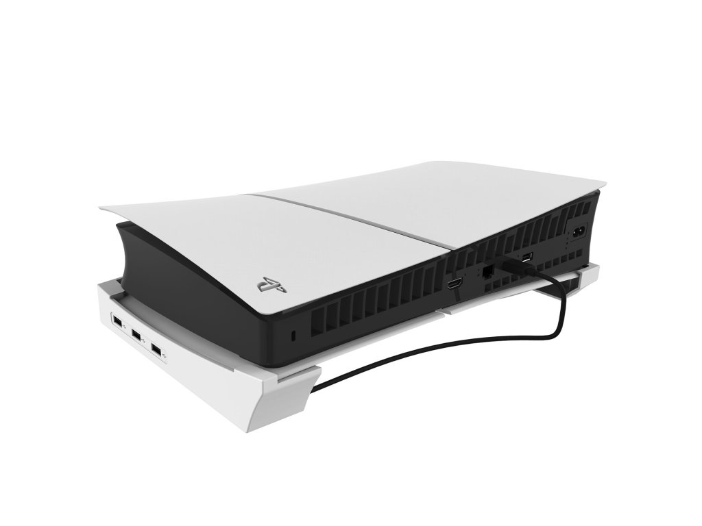 iPega P5S008 horizontální stojan určený pro Playstation 5 Slim.Stojan je vybaven USB Hubem, na kterém najdete celkem čtyři USB porty.